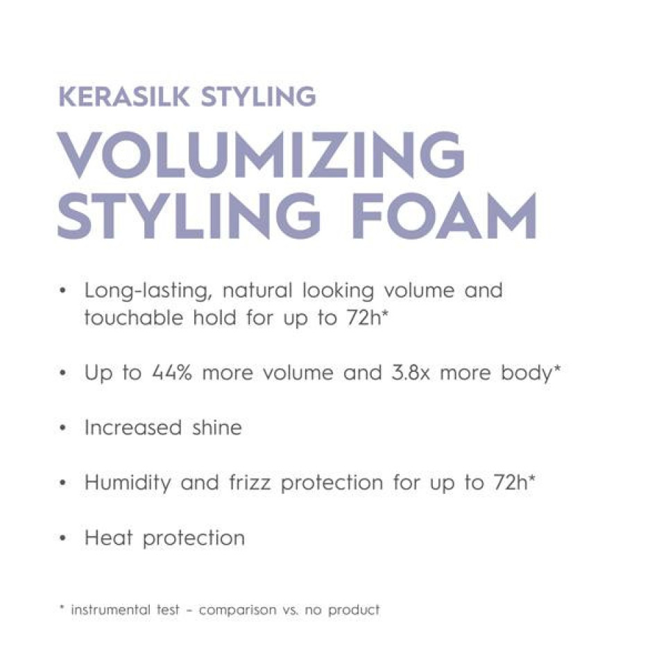 Boost volume and body with Kerasilk Volumizing Styling Foam. Lightweight formula with Biomimetic Silk and Blue Lotus Extract adds fullness, shine, and flexible hold for beautifully bouncy hair.
