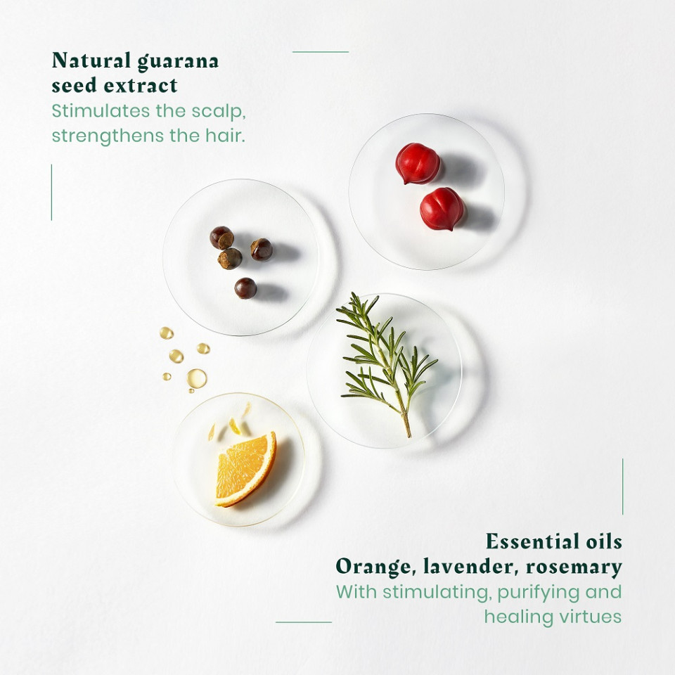 GUARANA Extract - Guarana, a mythical ingredient known for its energizing properties, has travelled across the world and across the ages. A symbol of strength and power, it has been cultivated by indigenous peoples in Brazil’s opulent Amazonia for centuries. This true nugget of energy has a seed rich in trace elements and vitamins and has one of the highest concentrations of caffeine found in the plant kingdom. The ultimate natural energizer, Guarana also fortifies the hair bulb extremely effectively.